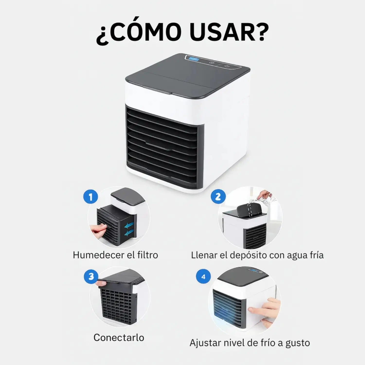 ¡Para nada! Solo llena el tanque de agua, conéctalo y ajusta la velocidad de ventilación. Todo se maneja con controles táctiles sencillos.